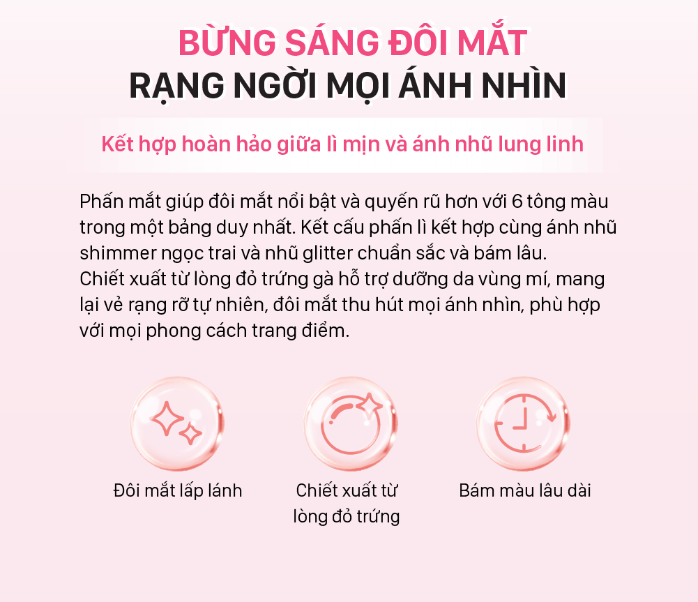 | Mô tả ngắn: | Bảng phấn mắt 6 ô màu tích hợp cả dạng phấn lì và ánh nhũ, với kết cấu mịn, bám dính tốt, giữ màu lâu trôi cả ngày. Thành phần chứa bột ngọc trai giúp ngăn ngừa lão hóa da và bắt sáng lấp lánh cho đôi mắt tươi sáng, nổi bật trẻ trung hơn |