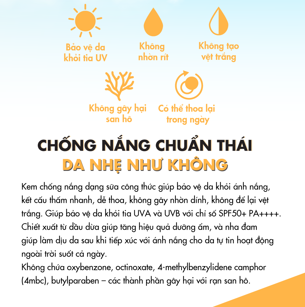 | Mô tả ngắn: | Kem chống nắng dạng sữa công thức giúp bảo vệ da khỏi ánh nắng, kết cấu thấm nhanh, dễ thoa, không gây nhờn dính, không để lại vệt trắng. Giúp bảo vệ da khỏi tia UVA và UVB với chỉ số SPF50+ PA++++. |